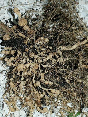 1. Root-knot eelworm. The larvae, which are about 0.5 mm long, bore into the roots, damage the plant by sucking the sap, and cause knot-like swellings due to secretions from their saliva glands; the swellings quite frequently reach the size of anything from a walnut to a fist.