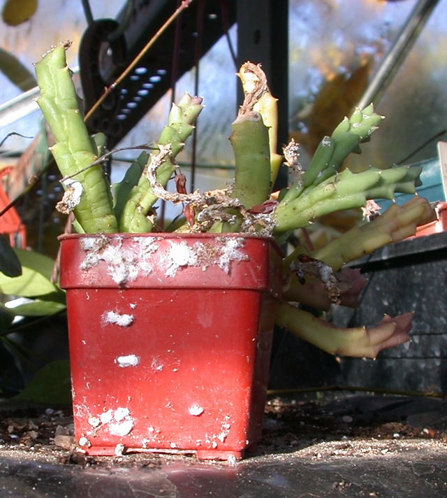 Root mealybugs (RhizoecusFalcifer) are among the worst pests of cacti and other succulents. They live almost exclusively on roots and the parts of the stem that are below the surface. They are similar to mealybugs in that they also secrete whitish, woolly, or powdery wax. Root mealybugs prefer dry substrates. They multiply particularly rapidly during the dry winter dormancy period. Affected plants look pale, become sickly, and gradually die. Plants damaged and weakened by root mealybugs are especially susceptible to fungal diseases.